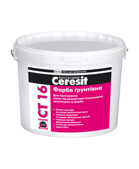 Грунтуюча фарба Ceresit СТ 16 призначена для попереднього оброблення основ з метою їх зміцнення і збільшення адгезії, а також спрощення виконання робіт з нанесенню декоративних штукатурок і фарб групи Ceresit СТ, а також для консервації штукатурок фасадів на зимовий період. Застосовується на основах з бетону, цементно-вапняних, цементно-піщаних штукатурок, цегли, на гіпсових поверхонь і т.п., на стінах і стелях усередині та зовні будівель. В фасадних системах скріпленої теплоізоляції Ceresit застосовується для підготовки захисного армованого шару під оздоблення.