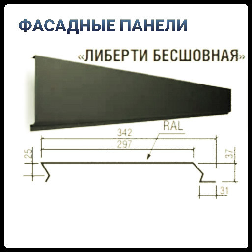 Корисна ширина фасадної панелі 297 мм, довжина під замовлення від 50 см до 4 метрів. Комплектація супутніми елементами та підсистемою.