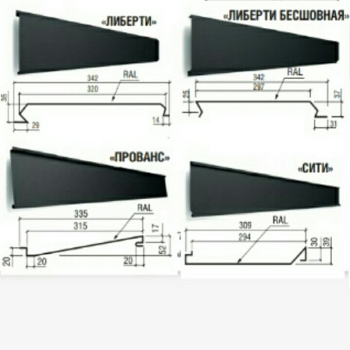 Фасадні панелі виготовляються в товщині 0,45-0,5 мм із рулонної оцинкованої сталі з полімерним покриттям колір RAL, а також зі структурою дерева.