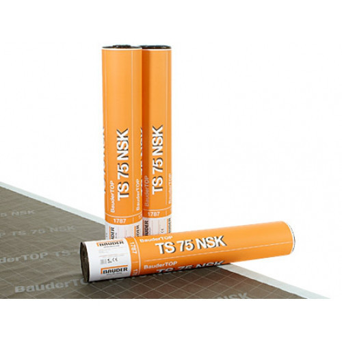 Баудер ТОП ТС 75 НСК Підкровельна полімер-бітумна мембрана з самокліючим швом по краю полотна, зі захисною плівкою. Основою мембрани є полотно з поліпропилену. Використовується як підкладочний килим під бітумну черепицю та/або як пароізоляція для надстропильної теплоізоляції. Верхній та нижній бік полотна покриті флісом з поліестеру. У покрівельній системі виконує функції гідро-або паро- ізоляції.Баудер ТОП ТС 75 НСК — самоклеющаяся полимербитумная подкровельная мембрана для битумной черепицы (подкладочный ковер). Полімербітумна мембрана завширшки 1,25 (м), з самоклейними швами по краю полотна, зі знімною захисною плівкою. Мембрана з обох боків має гідроізоляційні властивості.мембрана, яка надає додатковий захист від УФ-випромінювання й гідроізоляцію, дає змогу виконувати монтаж за будь-якої погоди, і допускає великі перерви між укладаннямкрізною мембрани і покрівельного покриття.