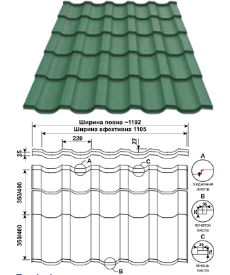 Геометрія металочерепиці REN (РЕН) представлена на малюнку: