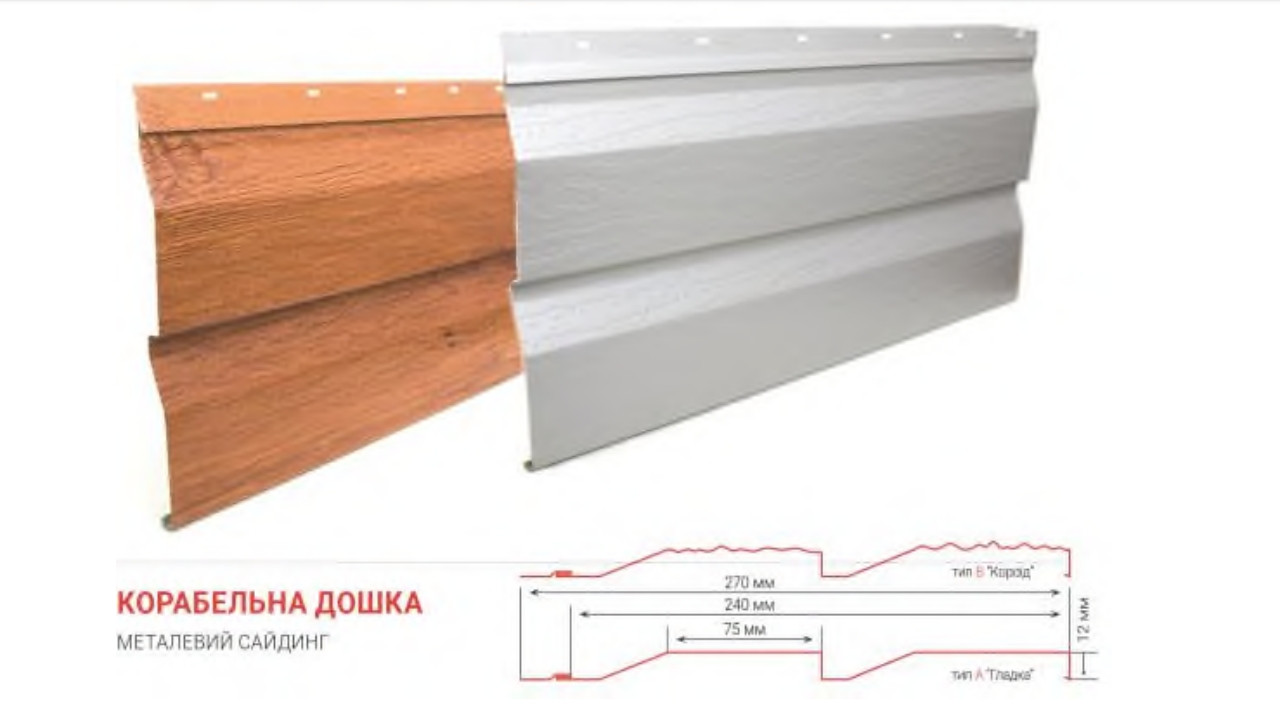 Одними з найпопулярніших різновидів панелей металосайдинга є «кораблева дошка» — різновид, що імітує своєю лицьовою частиною борт корабля, обшитий корабельною дошкою. Легкість, фізична міцність, гарна опірність агресивному зовнішньому середовищу, елементарна установлення власними руками — все це робить металосайдинг дуже популярним як серед професійних монтажників, так і серед тих, хто стикається з цим вперше.