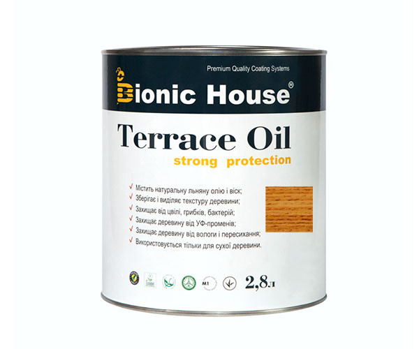 Для захисту та декоративного оздоблення терас, платформ, сходів, мостів та інших дерев’яних поверхонь. Виготовлено на основі лляної олії, завдяки чому волога легко проходить крізь деревину без утворення здутого покриття.
