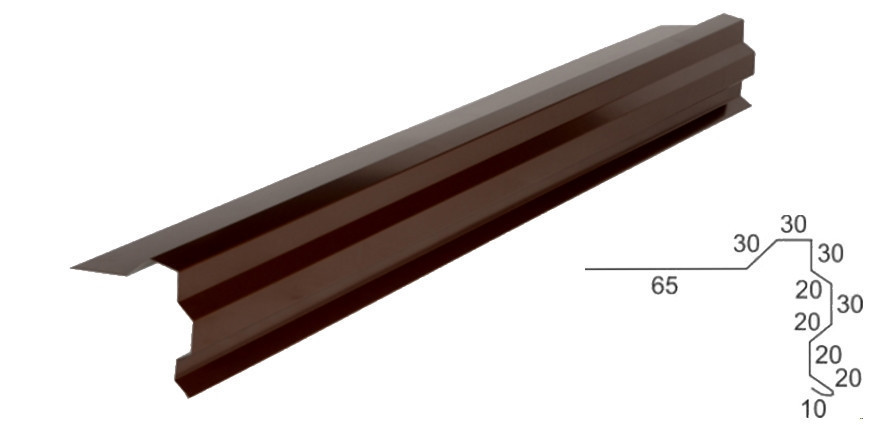 Планка торцева No1 Форма планки вибирається відповідно до архітектурного вигляду даху. Планка торцева застосовується для оформлення: 1. Фронтонов 2. Торців покрівлі Ми пропонуємо наступну палітру кольорів: коричневий матовий (Ral 8017), коричневий глянець (Ral 8017), бордовий глянець (Ral 3005), червоний глянець (Ral 3011), зелений глянець (Ral 6005), синій глянець (Ral 5005), сріблястий металік глянець (Ral 9006), білий глянець (Ral 9003), бежевий глянець (Ral 1015), Алюмоцинк Al-Zn.