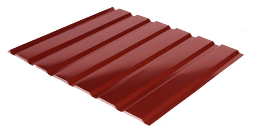 Профнактил С-18 RAL 3011 PE 0.45 фасад — це профнастил із полімерним покриттям поліестер глянсовий, червоного кольору (за класифікацією RAL — 3011) товщина металу 0,45 мм. Профнастил С-18 найчастіше застосовується для стінових і покрівельних покриттів (скатних дахів) промислових і цивільних будівель, має високу стійкість до корозії та механічних пошкоджень, також застосовується для облицювання будинків, обшивки балконів, у системах вентильованих фасадів, як зовнішній/внутрішній захисний елемент стінового огорожі, виготовленні парканів і воріт, для монтажу стінових внутрішніх перегородок, а також стель і багато іншого. Є найбільш економічним із профнастилів. Виготовляється з високоякісної оцинкованої сталі з полімерним покриттям. Можливе виготовлення будь-якої необхідної довжини від 0,4 м. пог. до 12 м. пог. раз 1 см. Ефективна ширина — 1128 мм Повна ширина — 1174 мм Термін виготовлення — від 1 дня.
