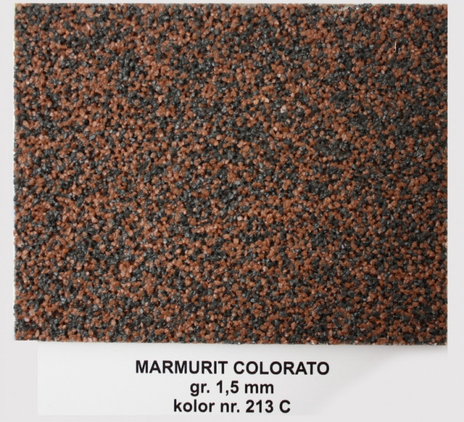 Висока стійкість до атмосферних умов; Зручна для підтримання чистоти. Опис продукту: MARMURIT є виключно декоративною, мозаїчною штукатурною масою на базі прозорої акрилової дисперсії та багатобарвної композиції натуральної та пігментованої крихти. Утворює дуже декоративне та довговічне покриття з високою стійкістю на стирання й до механічних пошкоджень. Має високу стійкість до забруднень і несприятливі атмосферні умови. Пропонується в широкій гамі меланжування, що дає змогу вільно формувати архітектурний вигляд будинків. Застосування: Слугує для ручного виконання захисно-декоративних, тонкошарових штукатурних покриттів зовні та всередині будівель. Призначена для декоративного оброблення поверхні стін у приміщеннях із великою інтенсивністю руху (як-от, наприклад, наприклад, наприклад, напр., сходові клітини, передпокою, коридори та комунікаційні переходи в будівлях громадського призначення), а також архітектурних елементів на фасадах будинків (як-от, наприклад, напр., цоколі, пилястри, декоративно-віддільні елементи). Застосовується як на мінеральних основах (як-от, наприклад, напр., бетон, цементна та цементно-вапняна штукатурка), так і покритих добре зв’язаним малярним шаром на основі пластмас. Перед нанесенням штукатурки основа має бути заґрунтована препаратом — GRUNT MARMURIT GT. Спосіб нанесення: нанесення та вирівнювання — напівтерком із неіржавкої сталі. Кольори: кольору меланжування згідно з колекцією KABE. Розмір зерна: 1,5 мм. Паковання: 15 кг.